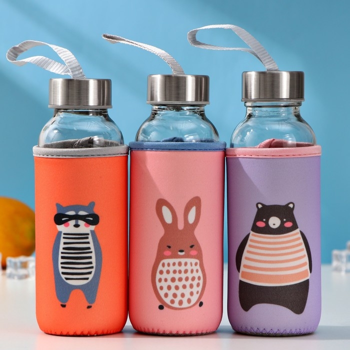Бутылка для воды стеклянная в чехле «Весёлые зверята», 300 мл, h=17 см, цвета МИКС