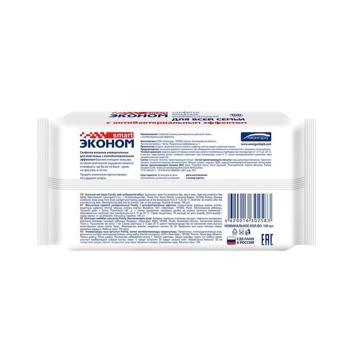 Влажные салфетки "Эконом" Smart, для всей семьи, антибактериальные, 100 шт