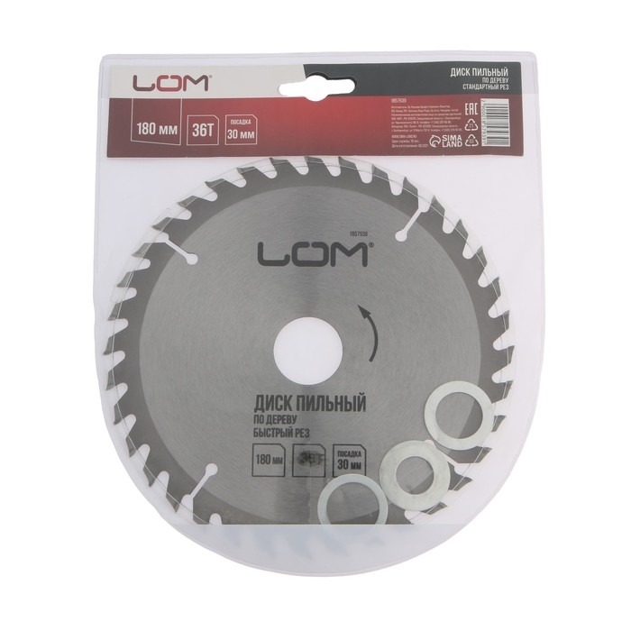 Диск пильный по дереву ЛОМ, стандартный рез, 180 х 30 мм (кольца на 20, 16), 36 зубьев
