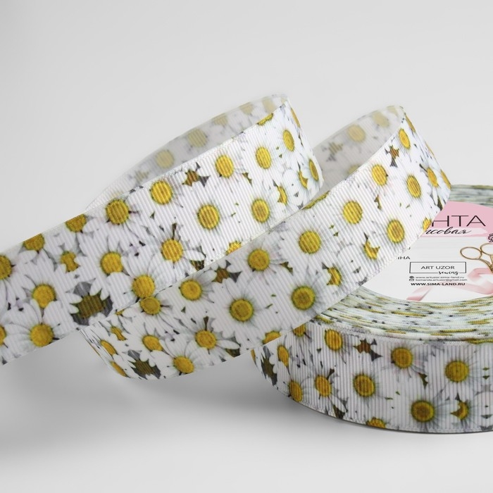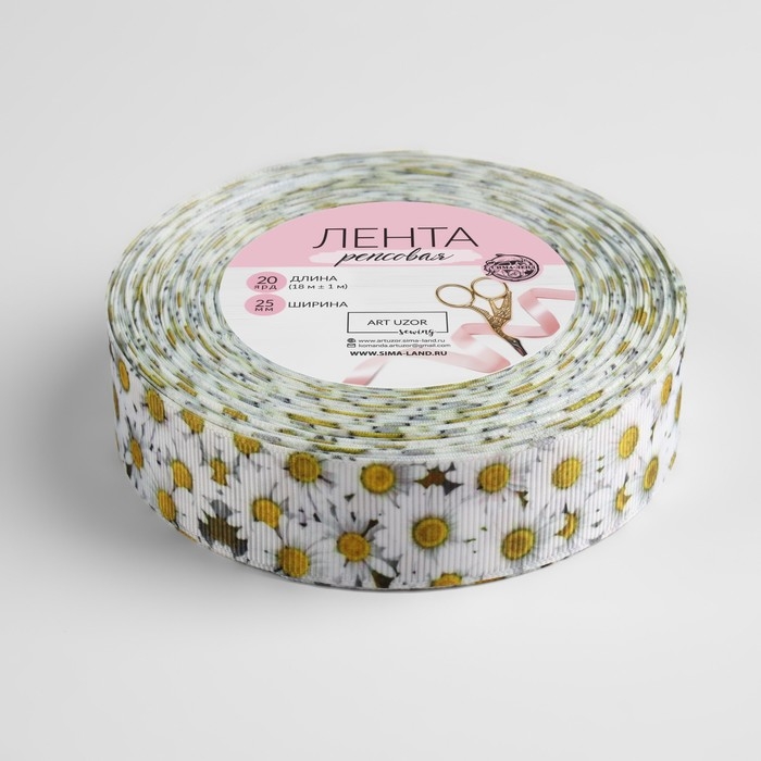 Лента репсовая «Ромашки», 25 мм, 18 ± 1 м, цвет белый/жёлтый