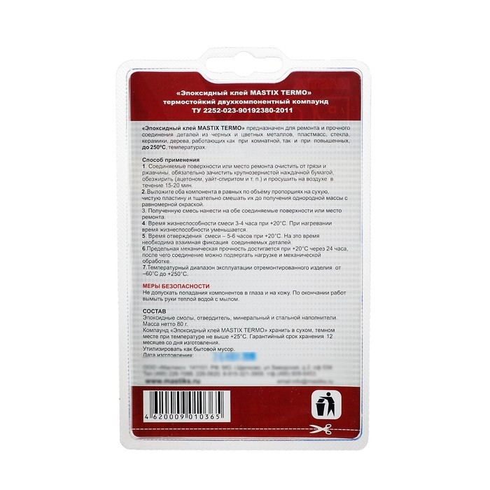 Клей эпоксидный MASTIX TERMO, термостойкий, 80 г предназначен для ремонта и прочного соединения деталей из чёрных и цветных металлов, пластмасс, стекла, керамики, дерева, работающих как при комнатной температуре, так и при повышенных температурах.