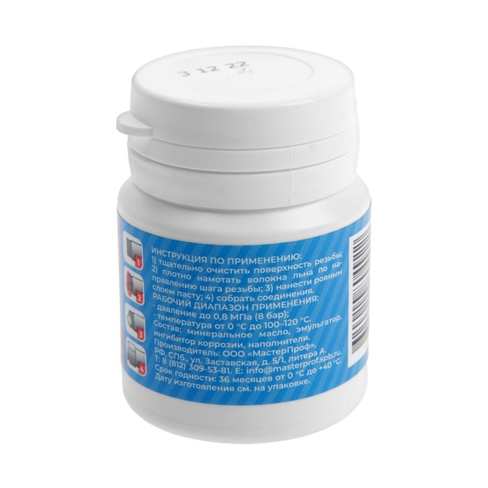 Уплотнительная паста MasterProf используется в сочетании с льняными волокнами и применяется для уплотнения резьбовых соединений в трубопроводных системах горячей и холодной воды, системах отопления, а также пара под низким давлением.