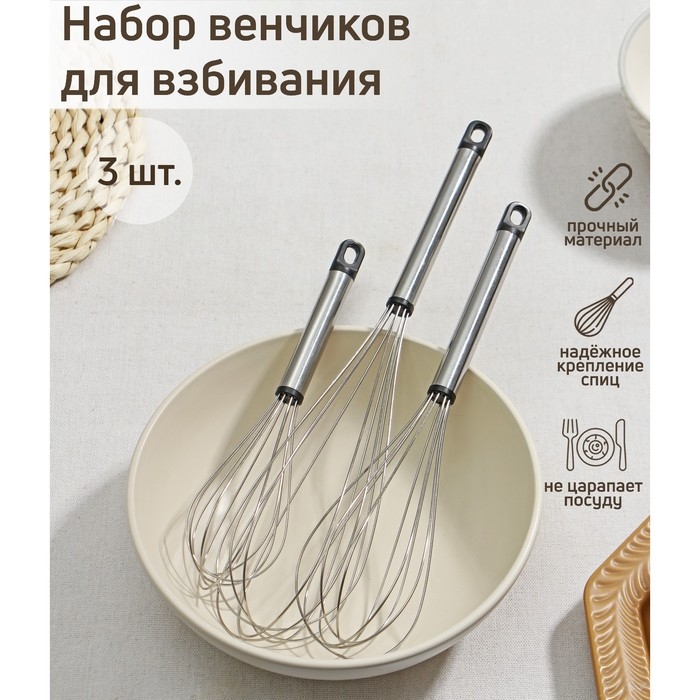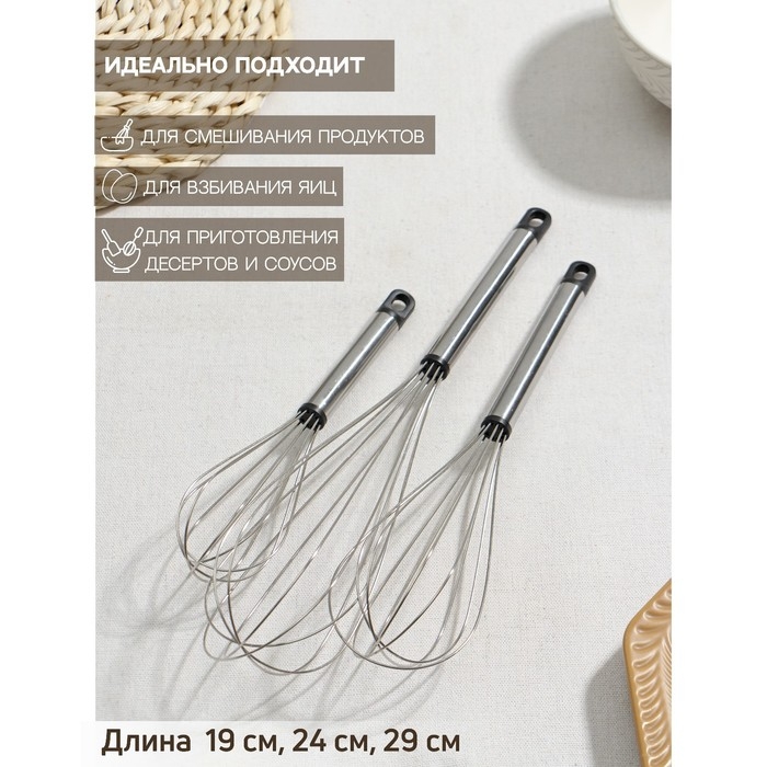 Набор венчиков для взбивания Доляна «Помощник», 3 шт: 19 см, 24 см, 29 см, цвет серебристый