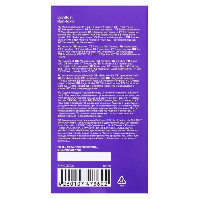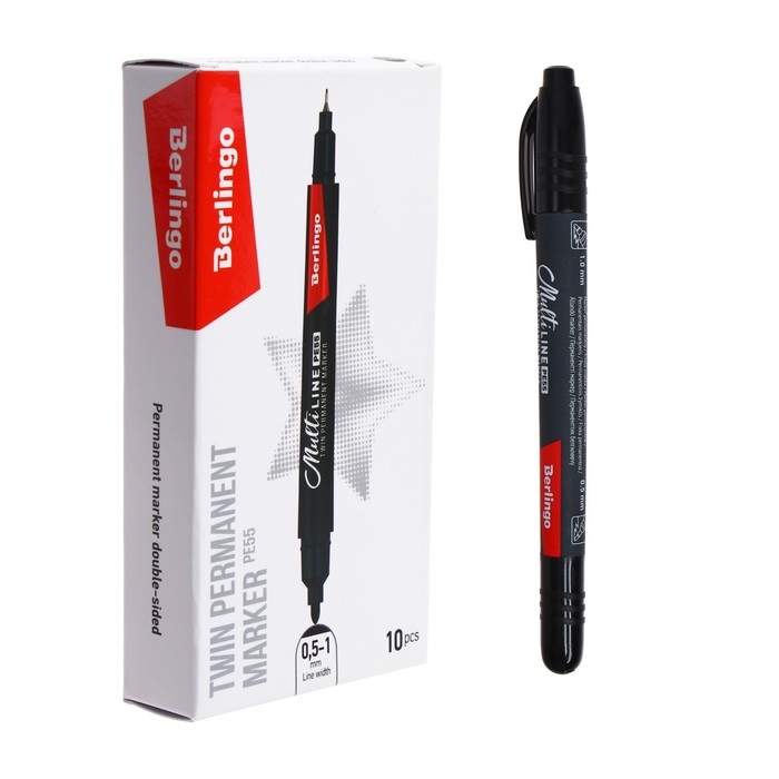 Двусторонний перманентный маркер Berlingo позволяет варьировать толщину линии от 0,5 до 1 мм. Заправлен стойкими и яркими чернилами на спиртовой основе. Подходит для использования на большинстве поверхностей, включая прозрачный пластик - не растекается. Цвет: черный.