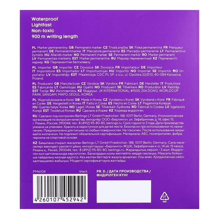 Берлинго создал идеальный инструмент для тех, кто ценит качество и удобство в каждой детали. Черные чернила на спиртовой основе обеспечивают насыщенный и устойчивый цвет, который не выцветает со временем. Пулевидный наконечник позволяет легко контролировать толщину линии, создавая аккуратные и точные надписи.