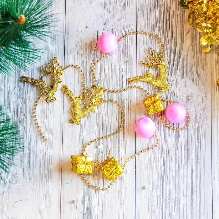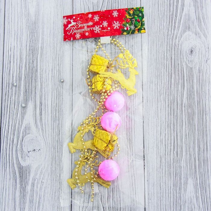 Бусы на ёлку 1 м "Подарки, олени и шарики" золотисто-розовый