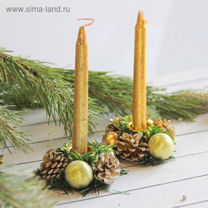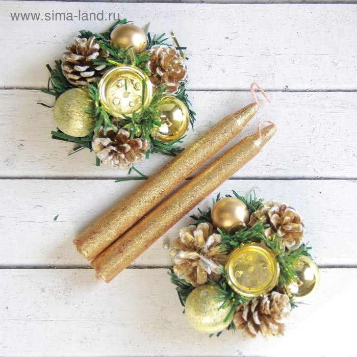 Свеча новогодняя с подсвечником "Золотые шары и шишки" (набор 4 шт) 3,5х15х11 см