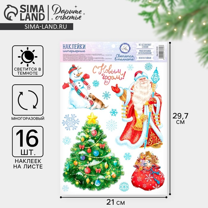 Наклейки новогодние, интерьерные со светящимся слоем «С Новым Годом!», 21 х 29,7 см, Новый год