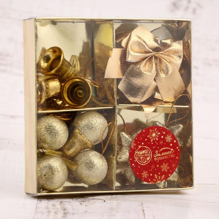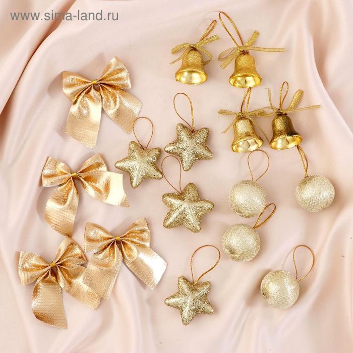 Набор украшений пластик 16 шт "Сюрприз" (4 колокол, 4 шара, 4 звезды, 4 банта) золото