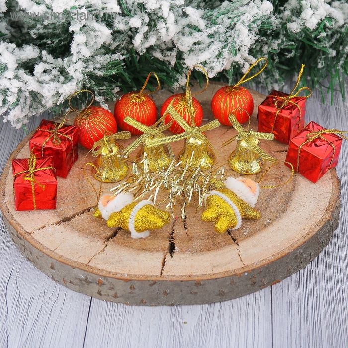 Набор украшений пластик 14 шт "Сюрприз" (4 колокольчика, 4 шара, 4 подарка, 2 Деда) золото, красный