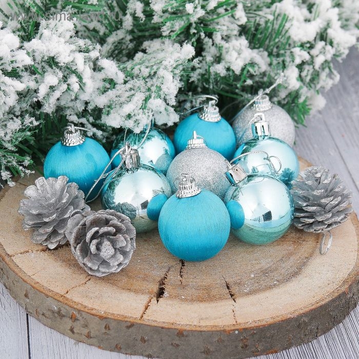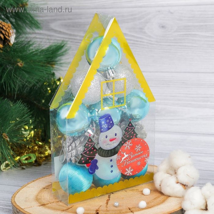 Набор украшений пластик 12 шт "Домик" (9 шаров,3 шишки) 4х11,5х20 см серебро, голубой