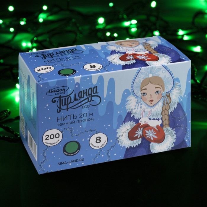 Гирлянда «Нить» 20 м, IP20, тёмная нить, 200 LED, свечение зелёное, 8 режимов, 220 В