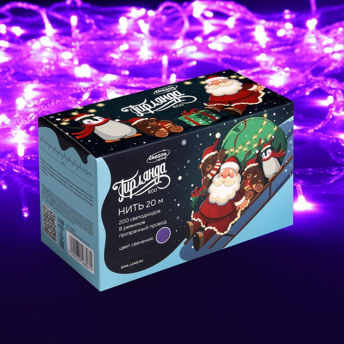 Гирлянда «Нить» 20 м, IP20, прозрачная нить, 200 LED, свечение фиолетовое, 8 режимов, 220 В