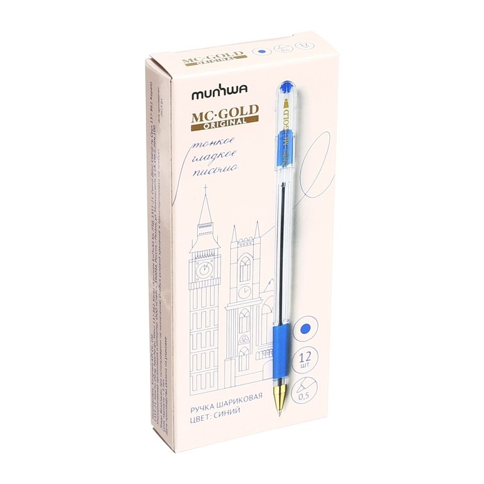 Легендарная шариковая ручка MunHwa MC Gold - одна из самых узнаваемых шариковых ручек. Диаметр пишущего узла составляет 0,5 мм. Толщина линии письма – 0,3 мм, а длина линии письма – 1200 м. Ручки упакованы в картонную коробку по 12 штук. Ручка проработана до мельчайших деталей: прозрачный шестигранный корпус диаметром 8,3 мм отлично сочетается с золотым наконечником и ребристым противоскользящим грипом под синий цвет чернил.