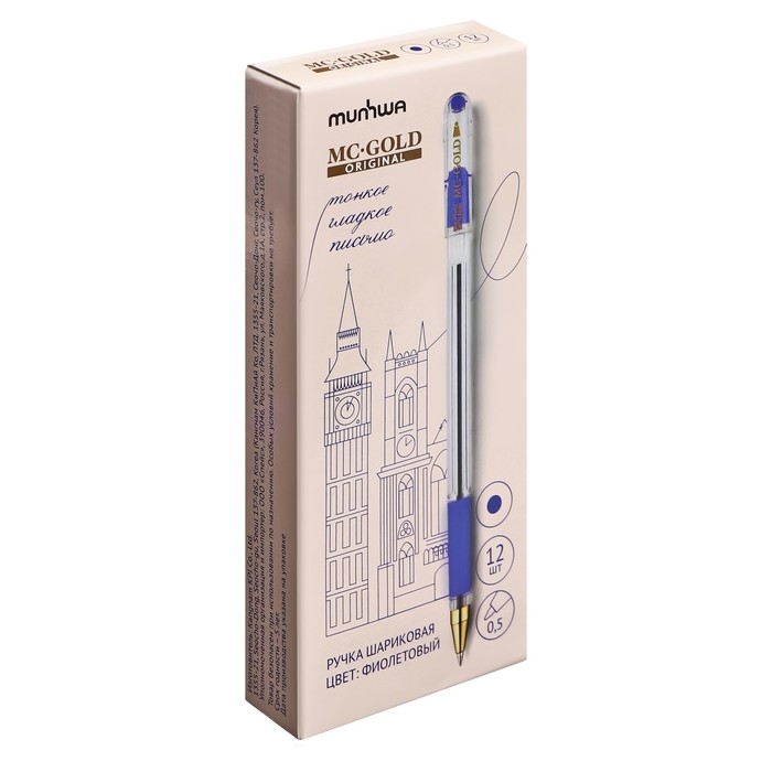 Легендарная шариковая ручка MunHwa MC Gold - одна из самых узнаваемых шариковых ручек. Диаметр пишущего узла составляет 0,5 мм. Толщина линии письма – 0,3 мм, а длина линии письма – 1200 м. Ручки упакованы в картонную коробку по 12 штук. Ручка проработана до мельчайших деталей: прозрачный шестигранный корпус диаметром 8,3 мм отлично сочетается с золотым наконечником и ребристым противоскользящим грипом под фиолетовый цвет чернил.