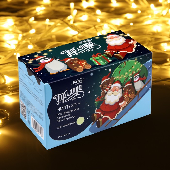 Гирлянда «Нить» 20 м, IP20, белая нить, 200 LED, свечение тёплое белое, 8 режимов, 220 В