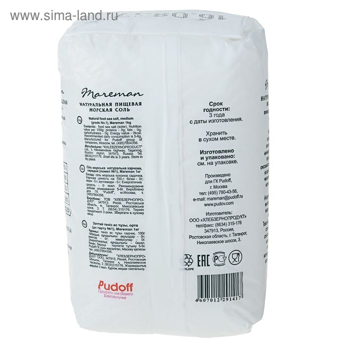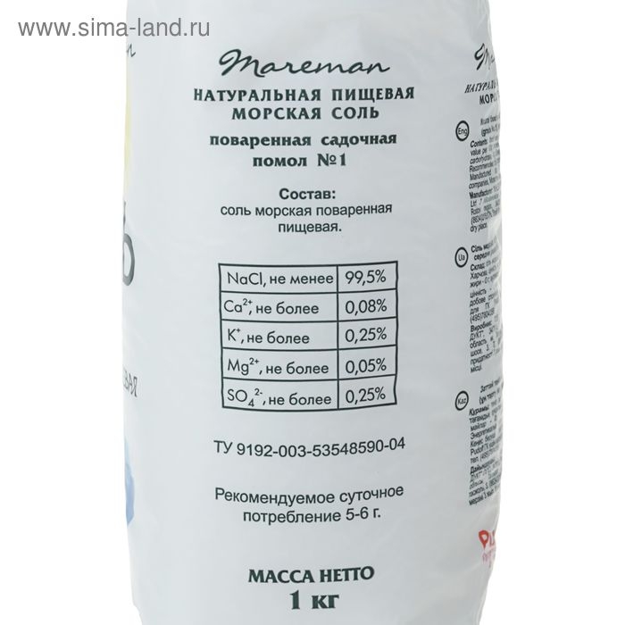 Соль морская натуральная пищевая, средняя (помол №1) "Mareman", 1кг