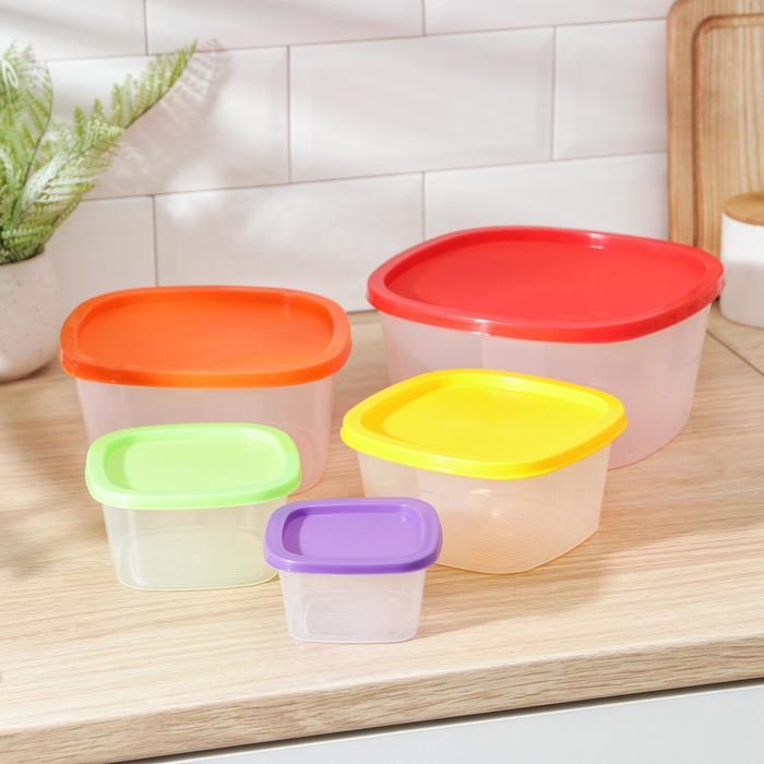 Набор контейнеров пищевых Доляна, 5 шт, 460 мл, 11×11×11 см, квадратные, прозрачные, крышки зелёные