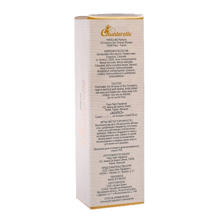 Chanterelle J`aime - цветочно-фруктовая композиция с нежностью жасмина, пряностью мускуса и кедра, чувственностью ванили и цветочно-фруктовым взрывом магнолии, дыни, персика, груши, бергамота, мандарина, мексиканской туберозы, сливы, фиалки, орхидеи, фрезии, ландыша и розы.