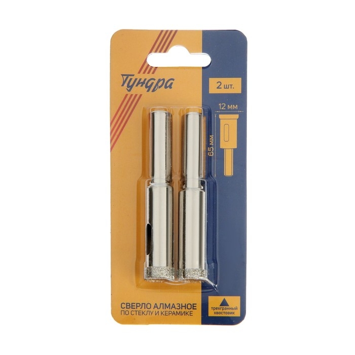 Сверло алмазное по стеклу и керамике ТУНДРА, трехгранный хвостовик, 12 х 65 мм, 2 шт.