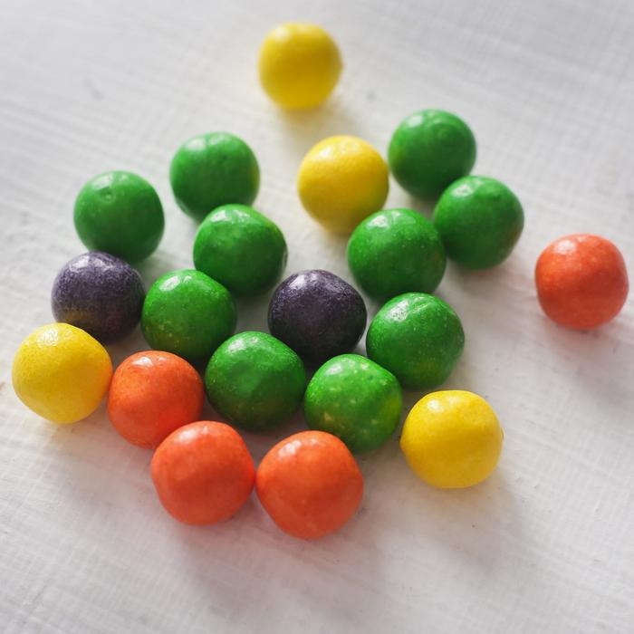 Состав: сахар, основа полимерная, патока, влагоудерживающий агент (глицерин пищевой), регулятор кислотности (кислота лимонная), ароматизаторы ("Тутти-фрутти", "Лимон", "Яблоко", "Апельсин", "Клубника", "Вишня"), эмульгатор (соевый лецитин), красители пищевые (Тартразин Е102, Диоксид титана Е171, Солнечный заказ FCF Е110, Кармуазин Е122, Красный очаровательный АС Е129, Синий блестящий FCF Е133), глазирователь (воск карнаубский).