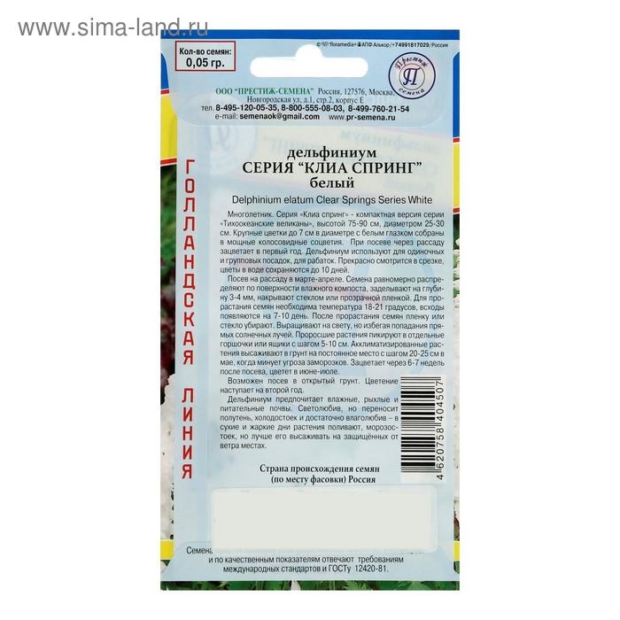 Семена цветов Дельфиниум "Клиа Спринг", Белый, 0,05 г