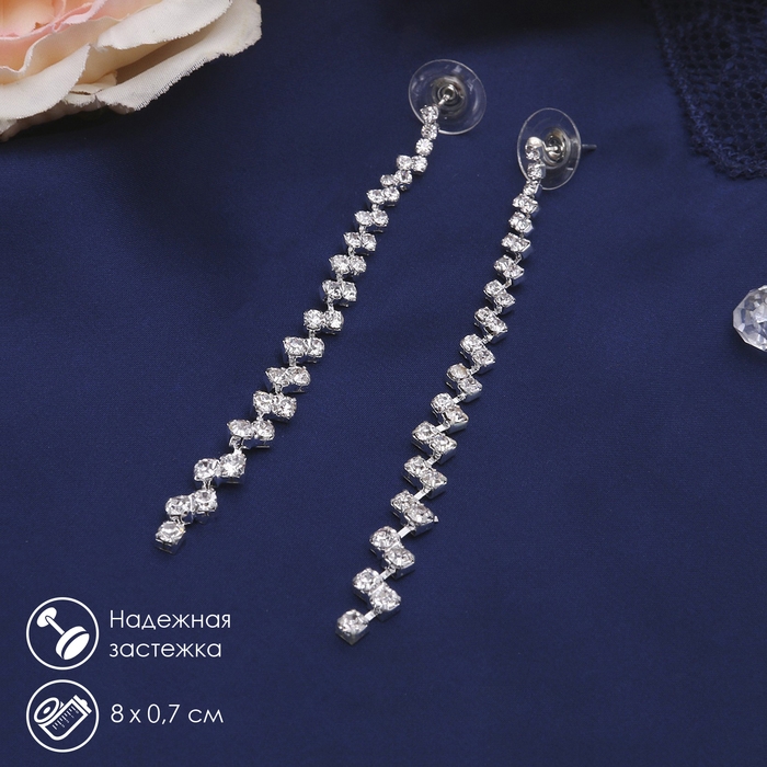 Серьги висячие со стразами Princess дорожка утончённая, цвет белый в серебре,8 см