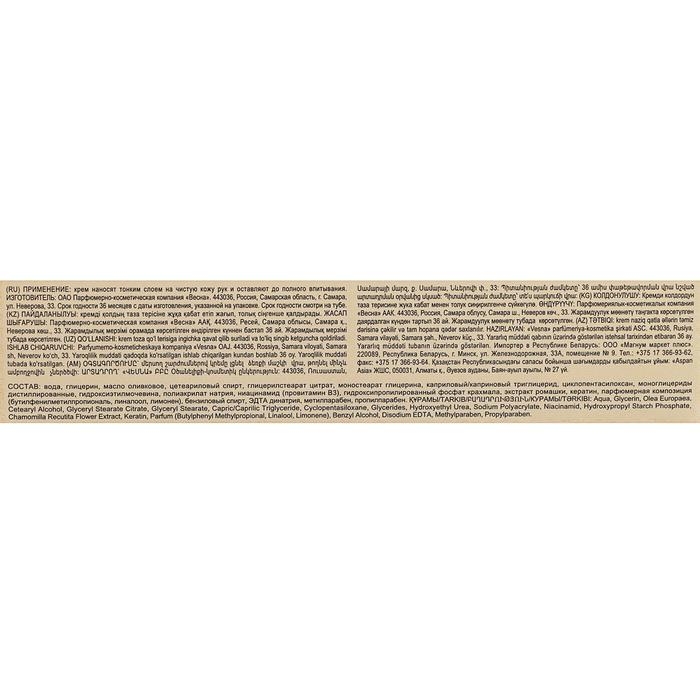 Крем для рук Ромашково-глицериновый разработан для интенсивного питания и смягчения кожи рук. Благодаря активным компонентам крем обеспечивает увлажнение, устраняет сухость, шелушение. Входящее в состав оливковое масло питает и смягчает кожу рук. Серия сделана по ГОСТу от бренда Весна с учетом современных стандартов качества. Крем для рук Ромашково-глицериновый белый, очень приятный и легкий, можно сказать нежный. Аромат крема натуральный, пахнет травами, слегка слышны ноты аптечной ромашки Крем для рук Ромашково-глицериновый легко распределяется и быстро впитывается в кожу, при этом не оставляя ощущения плёнки. Сразу же кожа рук становится гладкой, шелковистой и увлажнённой, при этом нет никакой излишней жирности. Кроме того, крем отлично ухаживает за ногтевой пластиной и кутикулой. Крем идеально распределяется по коже рук, лучше наносить крем на чуть влажную кожу рук, а потом ждать, пока крем медленно впитывается в кожу. Крем для рук можно использовать в качестве маски для рук.