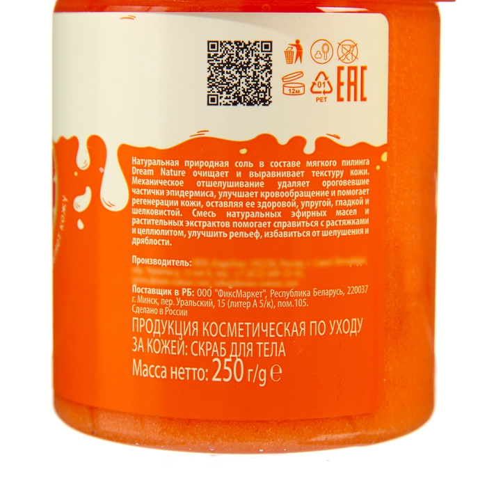 ей невероятную нежность и мягкость. Деликатные отшелушивающие частички выравнивают поверхность кожи, активизируя кровоснабжение подкожных тканей, способствуют обновлению клеток эпидермиса. Витамин С и салициловая кислота очищают кожу от мертвых клеток и других загрязнений, тонизирует и питает кожу любого типа. Эфирное апельсиновое масло в составе, является прекрасным средством для ухода за проблемной кожей и традиционно считается одним из самых эффективных масел от целлюлита. Помогает справиться с растяжками и улучшить состояние кожи.