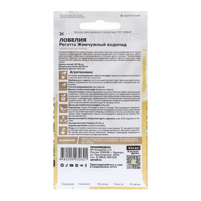 Лобелии серии Regatta являются эталоном среди ампельных лобелий. Они сочетают в себе экстра-раннее начало цветения, широкий выбор расцветок, продолжительное и обильное цветение. Растение сначала формирует сильно-ветвистый кустик, высотой 15-20 см, и затем, продолжающие свой рост побеги, начинают ниспадать каскадами ярких цветов, достигая длины до 35 см. В период цветения все растение покрыто одиночными, до 2 см в диаметре, жемчужно-белыми цветками. Отлично подойдет для выращивания в подвесных кашпо и балконных ящиках, вазонах и больших контейнерах, по периметру приподнятых клумб.Посев на рассаду в ящики под стекло с конца февраля по апрель. Субстрат – хорошо дренированный, торфяной. Внимание: семена поставляются в виде МУЛЬТИДРАЖЕ (из одного драже вырастает 5-7 сеянцев). Мультидраже располагают по поверхности слегка уплотнённого и увлажненного субстрата и увлажняют из распылителя. Не допускайте пересыхания оболочки мультидраже. Высадка рассады в грунт на постоянное место в мае-июне.