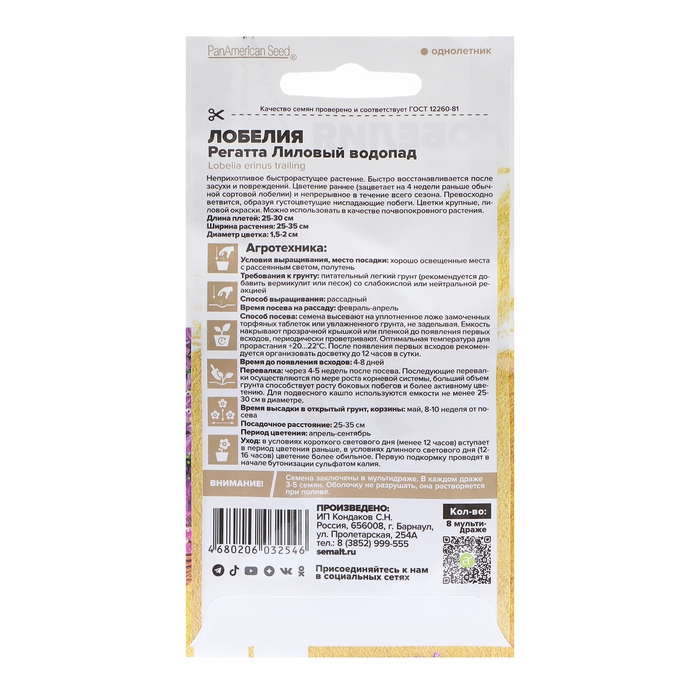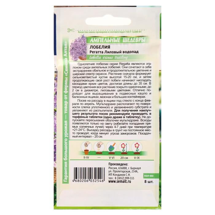 Однолетние лобелии серии Regatta являются эталоном среди ампельных лобелий. Они сочетают в себе экстрараннее обильное и продолжительное цветение и широкий спектр окрасок. Растение сначала формирует сильно ветвистый кустик высотой 15-20 см, и затем, продолжающие свой рост побеги, начинают ниспадать каскадами ярких цветов, достигая длины до 35 см. В период цветения все растение покрыто одиночными, до 2 см в диаметре, лиловыми цветками. Отлично подойдет для выращивания в подвесных кашпо и балконных ящиках, вазонах и больших контейнерах. Светолюбивое, теневыносливое и влаголюбивое растение, достаточно холодостойкое. Предпочитает незатенённые места с хорошо дренированными супесчаными и суглинистыми почвами средней влажности. Посев на рассаду в конце февраля-начале марта в ящики с лёгким грунтом. Семена заключены в мультидраже, их равномерно распределяют по поверхности влажного субстрата, слегка вдавливая в него. Не заглубляйте семена, так как для прорастания им нужен свет. Для получения наилучшего результата посев рекомендуем проводить в торфяные таблетки (одно драже в таблетку). Посевы увлажняют, накрывают пленкой и помещают в светлое теплое (+20-25оС) место, ежедневно их следует проветривать. Через 7-8 дней появятся всходы, пленку убирают. Рассаду перемещают в прохладное (+15-17оС) светлое место, оберегая от попадания прямых солнечных лучей. В условиях короткого светового дня всходам требуется досвечивание. С появлением 1-2-х настоящих листочков сеянцы пикируют. В открытый грунт на постоянное место рассаду высаживают когда минует угроза заморозков. Посадочный интервал 20-25 см. Цветение начинается через 70-80 дней от посева, с июня по сентябрь. Обрезка растений в августе, после основного цветения, стимулирует рост новых побегов и повторное цветение до глубокой осени. Внимание! Семена дражированные - оболочку драже не разрушать. Одно мультидраже содержит 3-5 семян. Благодаря этому при пикировке растение высаживается плотными пучками.