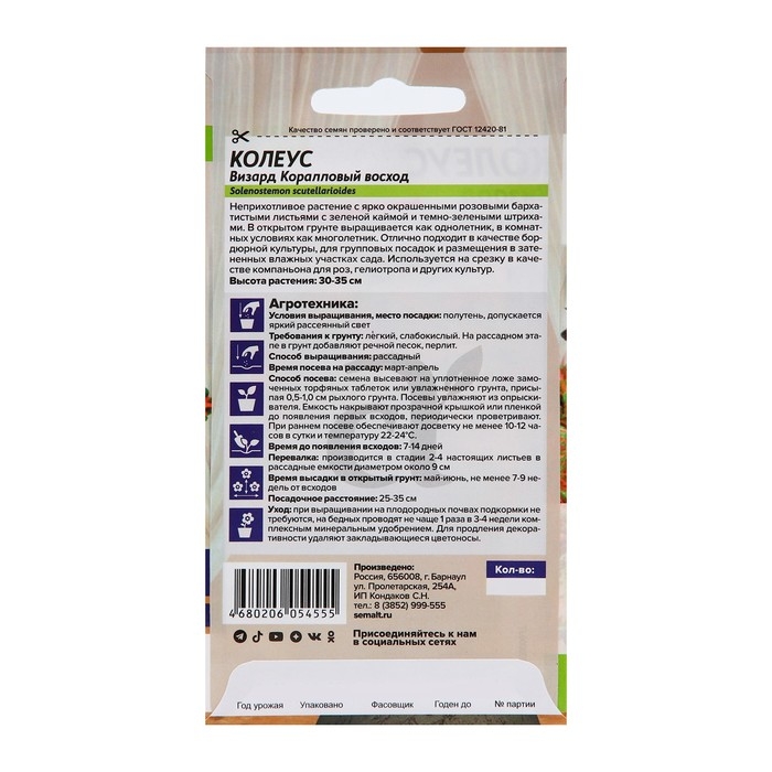 Семена комнатных цветов Колеус "Коралловый Восход", 5 шт