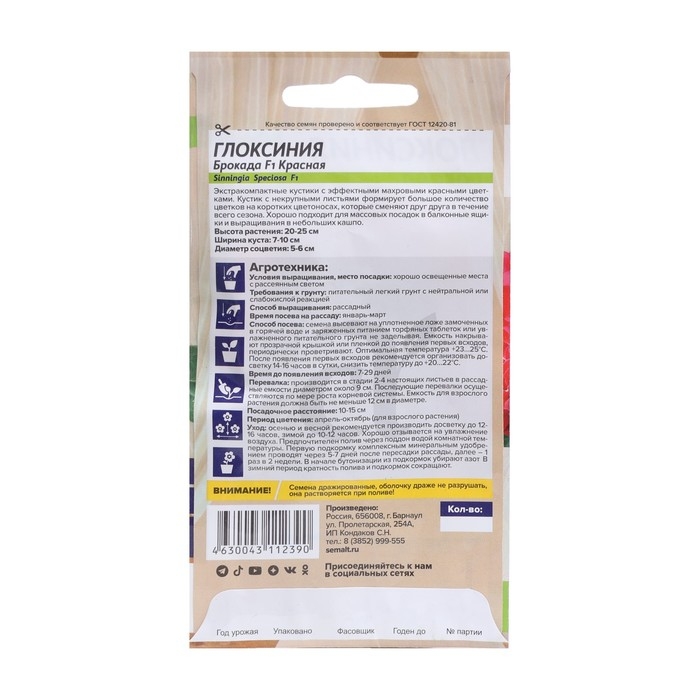Семена комнатных цветов Глоксиния Брокада "Красная", F1, 8 шт.