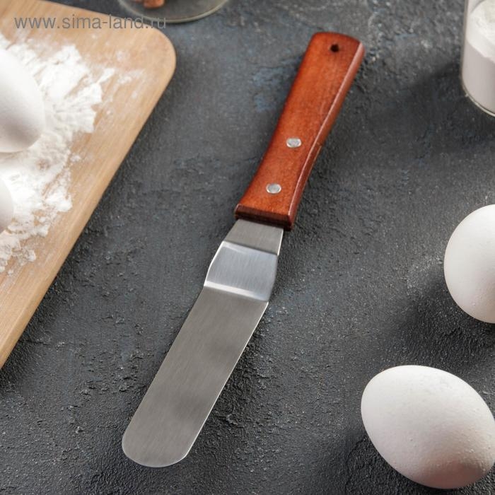 Эта лопатка изготовлена из нержавеющей стали и оснащена деревянной ручкой, что придает ей прочность и долговечность. Благодаря изогнутой форме и оптимальному размеру, она идеально подходит для нанесения и выравнивания кремов, глазури и других декоративных элементов. Коричневый цвет ручки добавляет изделию стильный внешний вид и привносит уют в любую кухню.