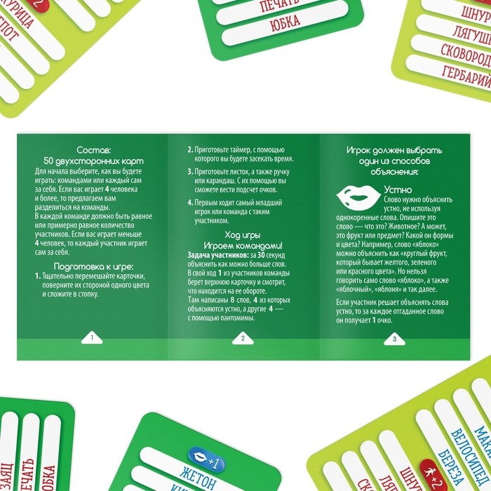 Проявите свои артистические способности — объясняйте с помощью мимики и жестов! Это значит, что нельзя произносить слова и звуки, а также чертить в воздухе очертания букв, цифр и указывать на предметы, о которых идёт речь в карточке. Если игрок объясняет пантомимой, то за каждое отгаданное слово он получает по 2 очка.