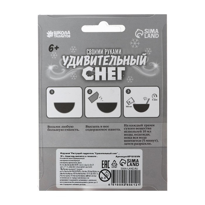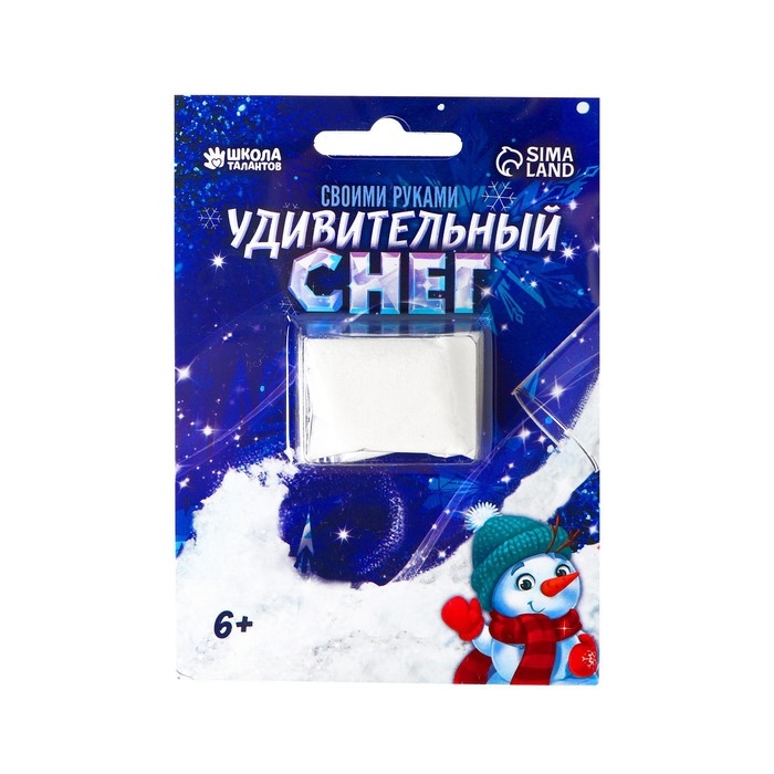 Оформите дом по-новогоднему ярко с помощью искусственного снега. Это праздничное украшение легко можно создать самому: добавьте воды в готовую смесь, подождите 5 минут — и пушистый нетающий снег готов. Из 10 г сухого вещества получится около 300 г снежного декора.