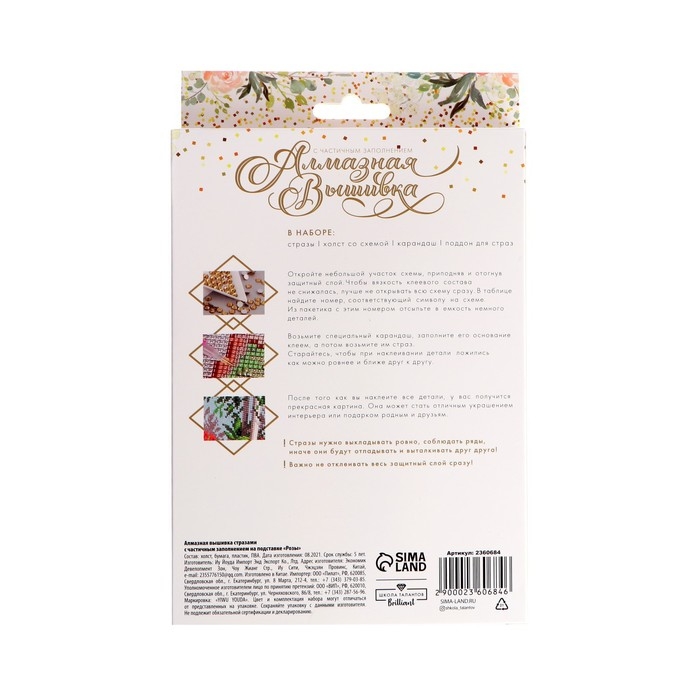 Часть полотна предстоит заполнить стразами, другая часть напечатана на самом холсте — такое изделие легче и быстрее создавать. Набор небольшого формата подойдёт для тех, кто впервые пробует свои силы в этой технике или любит быстро добиваться результата.
