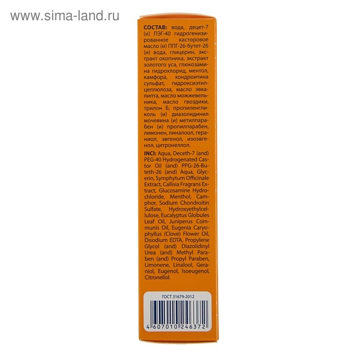 Состав: экстракты окопника и золотого уса, хондроитин, глюкозамин, ментол, камфора, масло гвоздики.