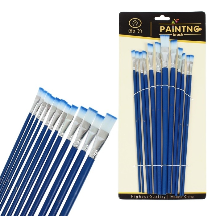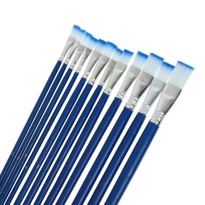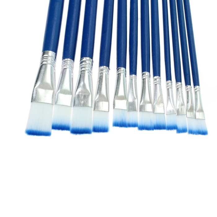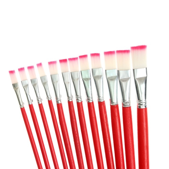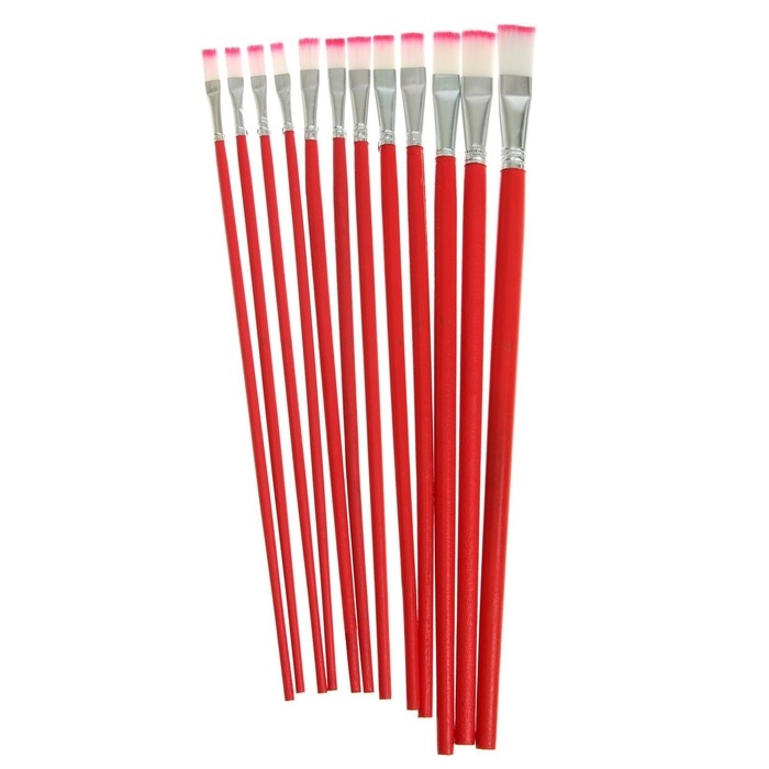 Набор кистей нейлон, плоские, 12 штук (№1, 2, 3, 4, 5, 6, 7, 8, 9, 10, 11, 12) с деревянными ручками