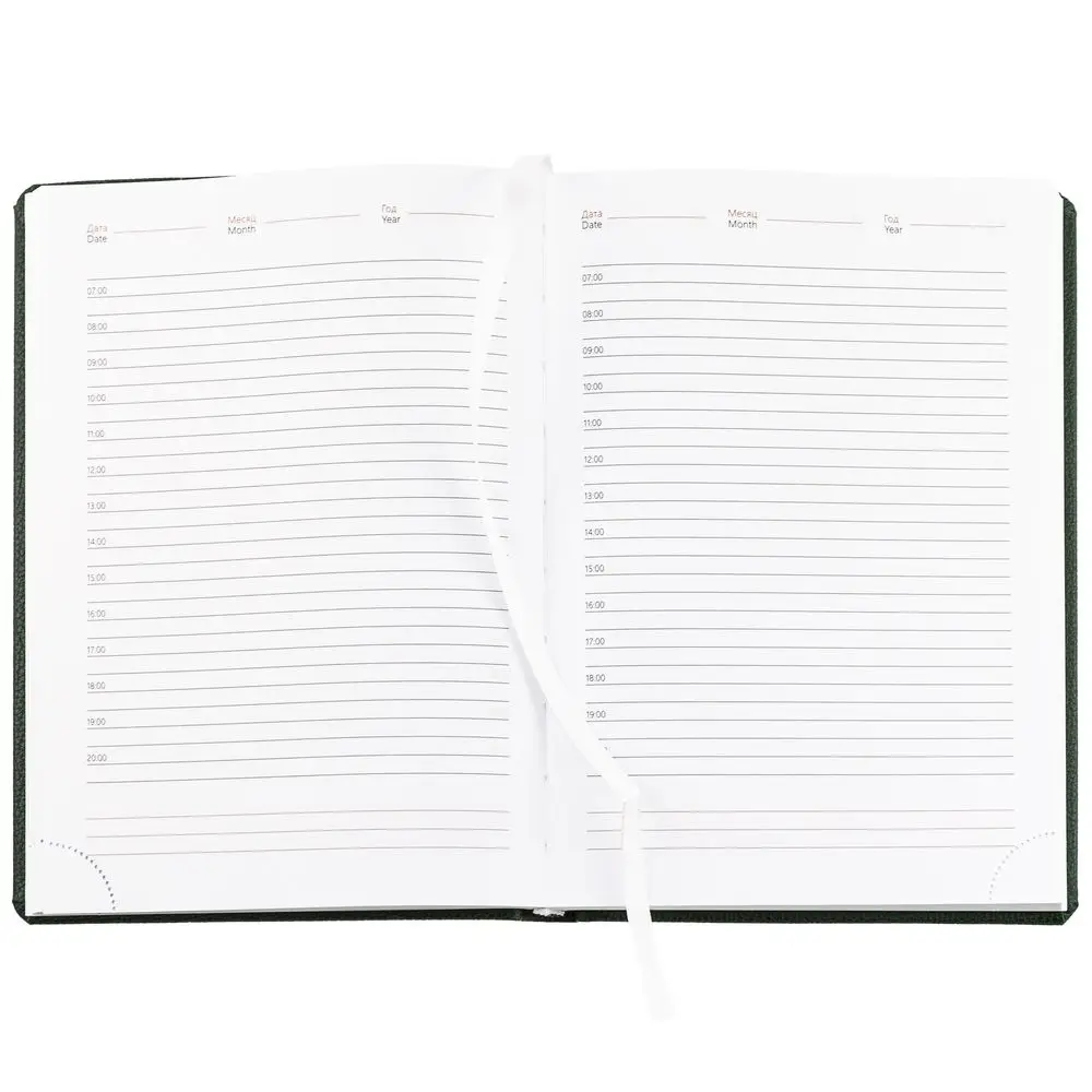 Ежедневник в твердой обложке c поролоном, выполнен из материала La Fite, зеленый FF, дополнен ляссе белого цвета.