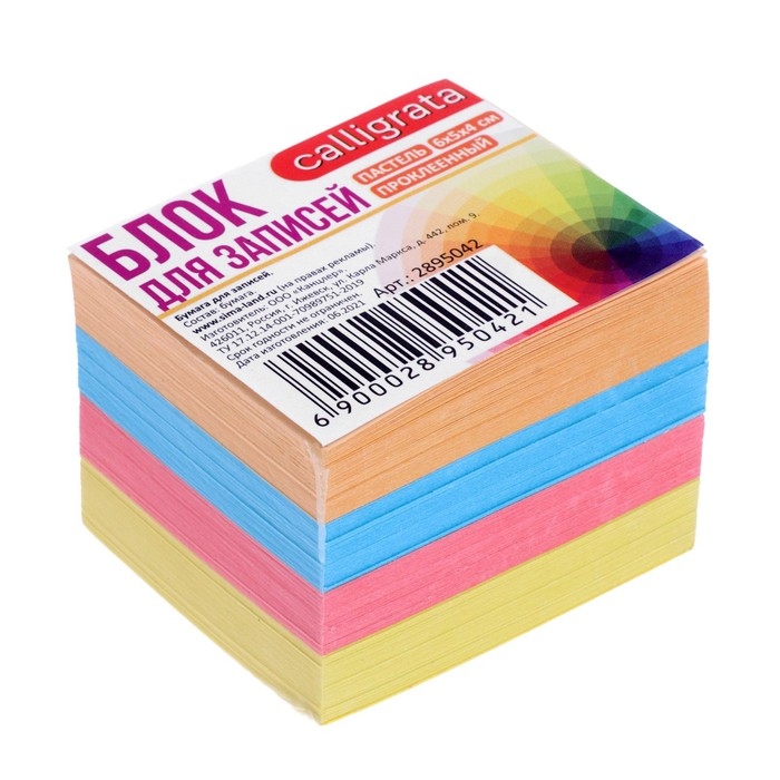 Блок бумаги для записей, на склейке, Calligrata, 6х5х4 см, 80 г/м2, цветной, пастель
