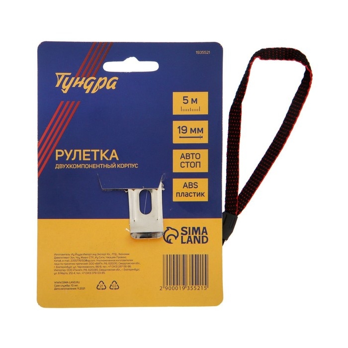 Рулетка ТУНДРА, двухкомпонентный корпус, автостоп, 5 м х 19 мм