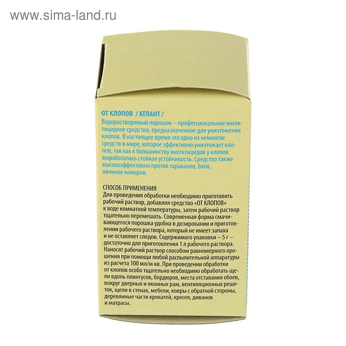 Профессиональный концентрат для борьбы с клопами "Атлант", банка, 5 г Назначение: для уничтожения клопов.Препарат эффективен против клопов, которые устойчивы к большинству средств. Порошок перед применением необходимо смешать с 1 л воды. Раствор не оставляет следов и запаха. Образует стойкую невидимую плёнку, после контакта с которой насекомые гибнут в течение нескольких часов.Действующее вещество: ацетамиприд (20 %). Способ применения: для проведения необходимо приготовить рабочий раствор, добавляя средство к воде комнатной температуры, затем тщательно перемешать.