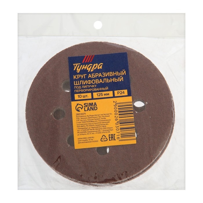 Круг абразивный шлифовальный под "липучку" ТУНДРА, перфорированный, 125 мм, Р24, 10 шт.