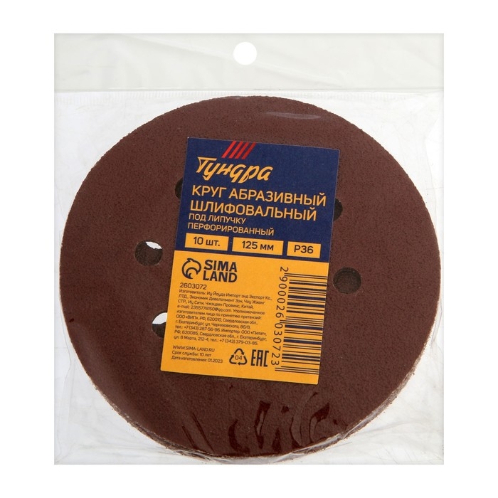 Круг абразивный шлифовальный под "липучку" ТУНДРА, перфорированный, 125 мм, Р36, 10 шт.