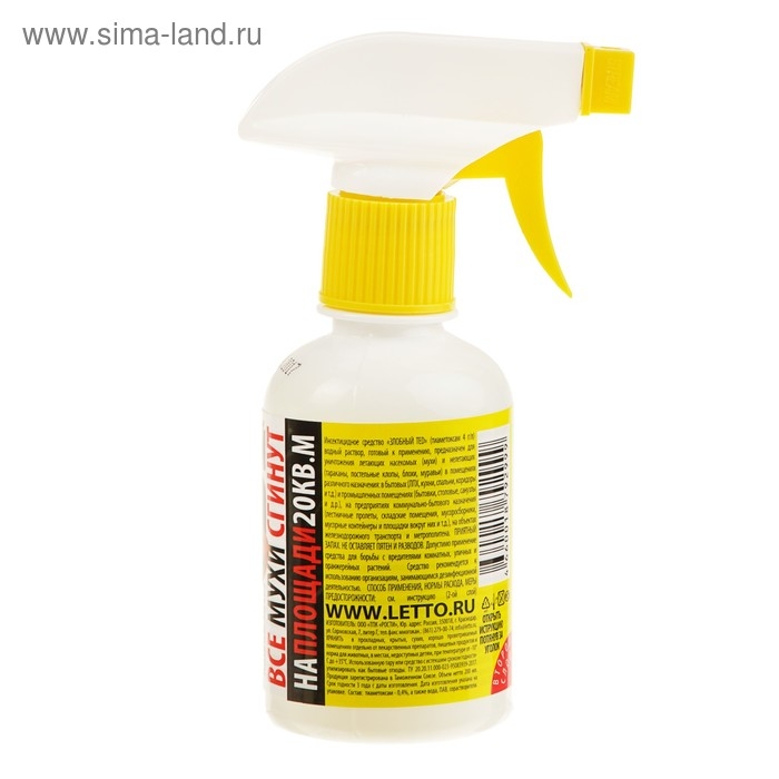 Инсектицидное средство «ЗЛОБНЫЙ TED» (тиаметоксам 4 г/л) водный раствор, готовый к применению, предназначен для уничтожения летающих насекомых (мухи) и нелетающих (тараканы, постельные клопы, блохи, муравьи) в помещениях различного назначения: в бытовых (ЛПХ, кухни, спальни, коридоры и т.д.) и промышленных помещениях (бытовки, столовые, санузлы и д.р.), на предприятиях коммунально-бытового назначения (лестничные пролеты, складские помещения, мусоросборники, мусорные контейнеры и площадки вокруг них и т.д.), на объектах железнодорожного транспорта и метрополитена. ПРИЯТНЫЙ ЗАПАХ. НЕ ОСТАВЛЯЕТ ПЯТЕН И РАЗВОДОВ. Допустимо применение средства для борьбы с вредителями комнатных, уличных и оранжерейных растений. Средство рекомендуется к использованию организациям, занимающимся дезинфекционной деятельностью.Способ применения: Перед использованием упаковку со средством необходимо встряхнуть. Перевести головку распылителя из нерабочего (OFF) в рабочее (SPRAY или STREAM) положение. Для обработки нажимать на курок распылителя, направляя его головку на обрабатываемую поверхность. За одно нажатие на курок из упаковки в среднем выходит: в режиме «SPRAY» – 0,5 мл, в режиме «STREAM» – 0,8 мл средства. Струей средства обрабатывают места скопления, обитания и проникновения в помещение насекомых, нажимая на распылительную головку с расстояния 30-50 см от обрабатываемой поверхности. По окончании работы со средством следует перевести головку распылителя в нерабочее положение (OFF).Уничтожение мух производят одним из двух способов:Сплошное нанесение (не требует дополнительных действий): Обработать средством места посадки мух в жилых и производственных помещениях: рамы окон, подоконники, дверные коробки, плафоны, потолки. Норма расхода средства 100 мл/кв.м обрабатываемой поверхности.Приготовление приманок (увеличивает пищевую привлекательность инсектицида, наиболее эффективно по действию): аккуратно открутить распылитель от флакона, добавить в раствор (200 мл) – 20 грамм сахарного песка (4 ч.л), надеть распылитель и тщательно встряхнуть приманку в течение 20-40 сек до полного растворения кристаллов сахара. Нанести приманку на подложки из расчета на одну подложку 1,5-2,5 г (3-5 нажатий на курок распылителя в режиме «SPRAY»). Расставить подложки в местах активности мух. Норма расхода – 2-3 подложки с приманкой на помещение площадью 10 кв.м. Расход средства зависит от численности мух и санитарного состояния помещений. При использовании метода расстановки приманок из средства с сахаром - 200 мл в среднем хватит для обработки 250 кв.м общей площади помещений. Повторные обработки проводят при появлении имаго мух в помещении.Норма расхода средства для уничтожения тараканов, постельных клопов, блох, муравьев, при его использовании способом орошения, составляет 10 мл/кв.м на поверхностях, не впитывающих влагу, и 20 мл/кв.м на поверхностях, впитывающих влагу, что соответствует 20 или 40 нажатиям на курок в режиме «SPRAY» и 12 или 25 нажатиям в режиме «STREAM». Повторные обработки -помещений проводят по энтомологическим показателям .Состав: тиаметоксам, вода, ПАВ, сорастворители