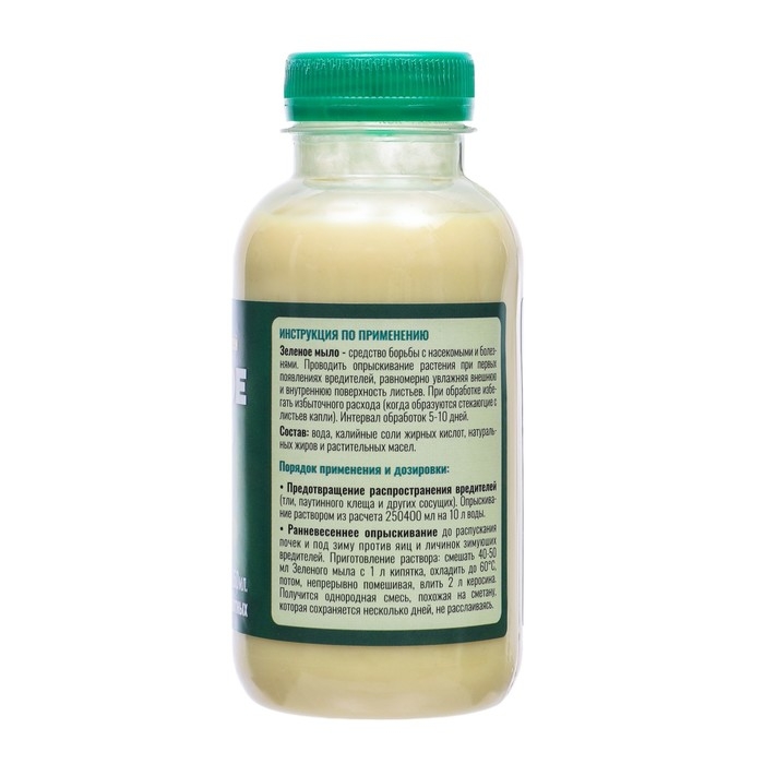 Зеленое мыло — низкотоксичный для человека инсектицид, имеющий профилактическую эффективность в отношении внушительного спектра сосущих вредителей сада/огорода. Используя зеленое мыло от вредителей, в рабочий раствор для опрыскивания культур часто включают посторонние примеси, усиливающие токсический эффект на паразитов (древесная зола, керосин, медный купорос и пр.). Это хороший прилипатель, имеющий оптимальную совместимость с другими нестойкими пестицидами.