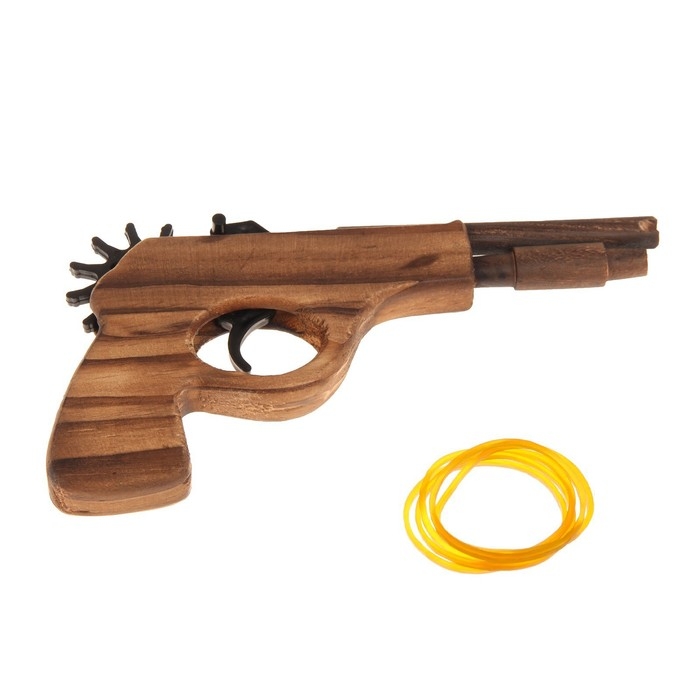 - Возьмите резинку и натяните один её край на зазубрину колеса, а другой — на наконечник с выемкой.