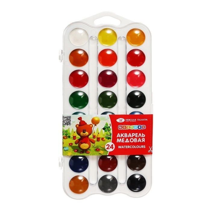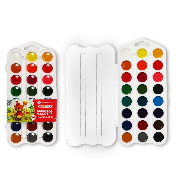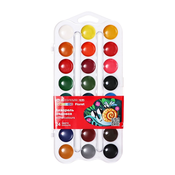 Акварель медовая 24 цвета, ЗХК "Цветик", без кисти, белый пластиковый футляр, 2742190