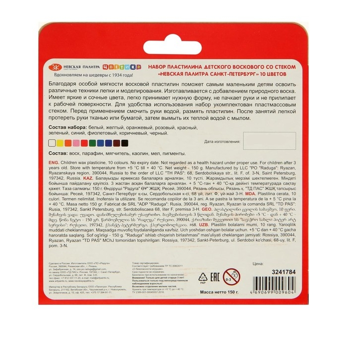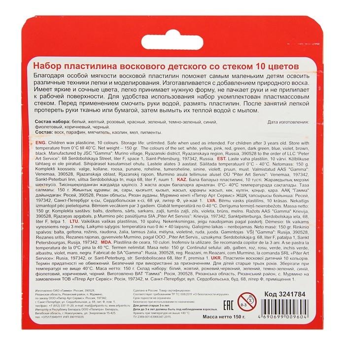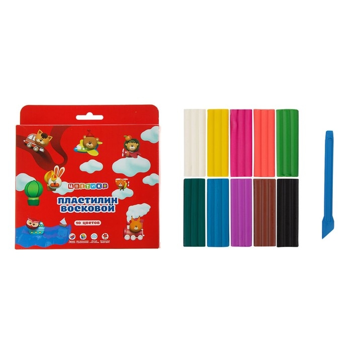 Набор пластилина воскового детского со стеком. Благодаря особой мягкости восковой пластилин поможет самым маленьким детям освоить различные техники лепки и моделирования. Изготавливается с добавлением природного воска. Имеет яркие и сочные цвета, легко принимает нужную форму, не пачкает руки и не прилипает к рабочей поверхности. Для удобства использования набор укомплектован пластмассовым стеком. Перед применением смочить руки теплой водой. После занятий лепкой протереть руки тканью или бумагой, затем вымыть их теплой водой с мылом.